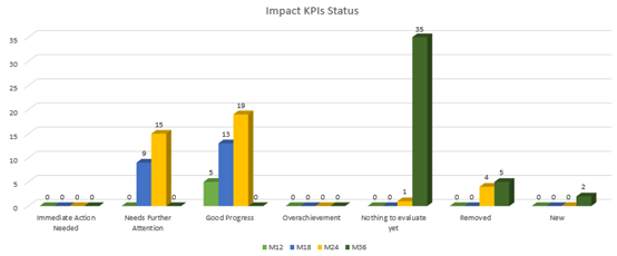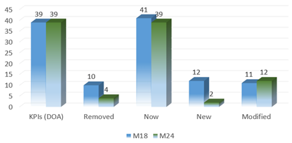 Impact KPIs are reviewed and evaluated based on the progress of their execution plan and are dependent on the progress of each Work Package (WP) in order for WP teams to have the chance to fine tune – or change course entirely. KPIs of DataPorts are not static and therefore, there is always a need to evolve, update and modify as needed, otherwise the risk of not fulfilling a KPI is increased. This monitoring and evaluation process resulted in the KPIs’ continuous adjustments, such as, removing KPIs, replacing them with a more realistic ones, or adding new ones. The current status and their progress can be seen in the Figure below.