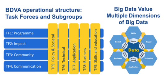 The Big Data Value Public-Private Partnership aims at creating a functional Data Market and Data Economy in Europe, in order to allow Europe to play a leading role in Big Data in the global market. DataPorts is part of the implementation actions of the Big Data Value PPP, composed of the European Commission (EC) and the Big Data Value Association (BDVA) as public and private counterparts. BDVA is an industry-driven international not–for-profit organization with 200 members all over Europe, whose mission is the development of the Innovation Ecosystem that will enable the data and AI-driven digital transformation in Europe to deliver maximum economic and societal benefit, as well as achieving and sustaining Europe’s leadership on Big Data Value creation and Artificial Intelligence. The main activity of BDVA is centered on its Task Forces, and it is reported and communicated in the Activity Group meetings that are organized on a monthly basis. Many of DataPorts partners (ITI, UPV, ICCS, Everis, UDE, Fraunhofer ISST and CERTH) are BDVA members, and will represent DataPorts in different meetings. The objective is to engage at least in two subgroups of BDVA: Task Force 1 Sub-group 7 (Data Sharing Spaces) and Task Force 7 Sub-group 7 (Mobility and Logistics).