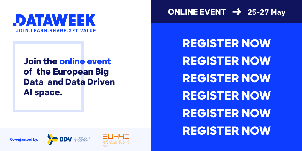 Data Week is the spring gathering of the European Big Data Value and Industrial AI research and innovation community. This year, Data Week will be held online from 25th to the 27th of May. The event is co-organised by BDVA/DAIRO and EUHubs4Data project. You can find more information about the Data Week 2021 and register here.